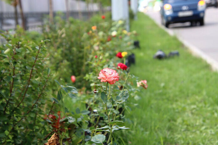 Газон улицы Ленина вдоль центральной площади Свободного украсили цветущие розы. Высаженные цветы - подарок городского плодопитомника ко Дню города.
