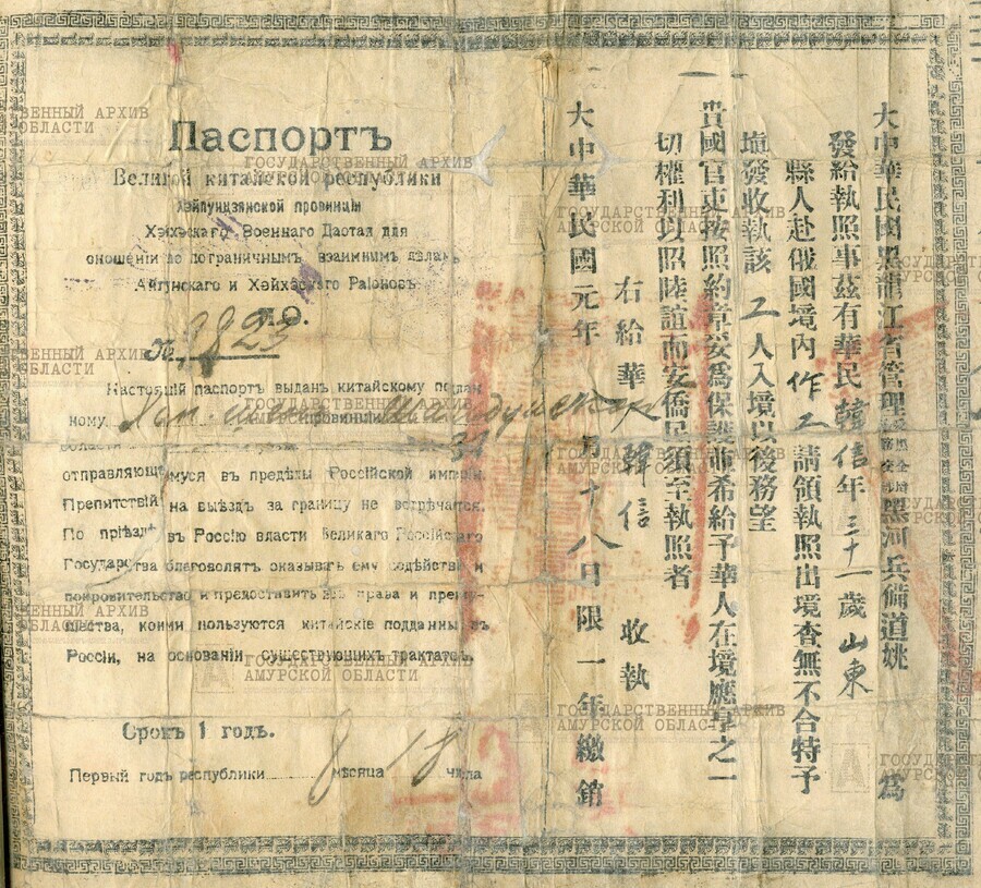 «В официальном документе, кроме имени и возраста обладателя, сообщалось следующее: «Настоящий паспорт выдан китайскому подданному …, отправляющемуся в пределы Российской империи. Препятствий на выезд за границу не встречается. По приезде в Россию власти Великаго Российскаго Государства благоволят оказывать ему содействие и покровительство и предоставить все права и преимущества, коими пользуются китайские подданные в России на основании существующих трактатов», - рассказали в Государственном архиве Амурской области.