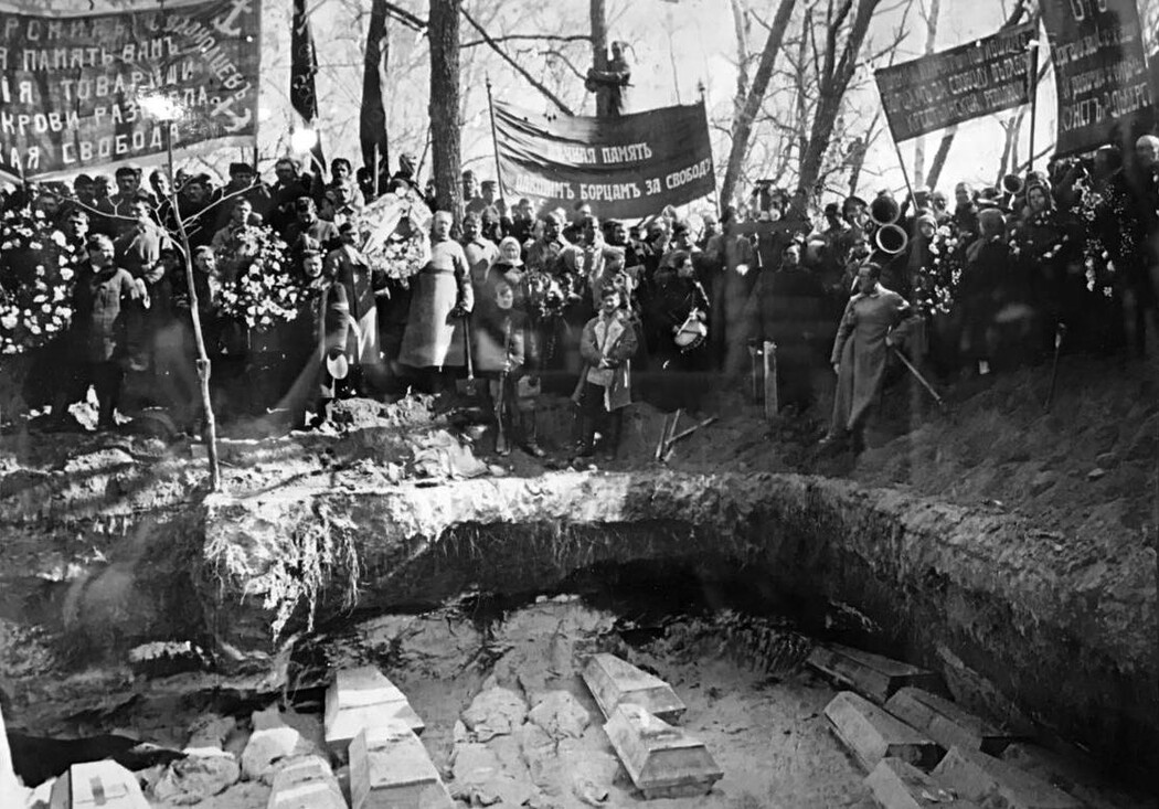 Газета «Голос труда» сразу же после официальных похорон (24(11).03.) напечатала большую статью, в которой подробно описывалась вся церемония прощания и погребения жертв этой гражданской войны в братской могиле. Из текста следует, что всего в процессии участвовало свыше 30 различных организаций с тридцатью пятью знаменами (в основном красные, но было и 5-6 черных); впереди процессии несли венки, их было около 20-ти, самым большим из них был металлический венок от судоходцев; к моменту приближения к архиерейской даче в ней участвовало уже тысяч шесть или семь…; помимо разных политических партий и военных, было много профессиональных союзов – металлистов, амурских судоходцев, деревообработчиков, транспортных рабочих, домашней прислуги, ломовых извозчиков, работников печатного дела, тружеников музыки, сцены и кино, торгово-промышленных служащих и конторщиков и др.; оркестр и хор поочередно исполняли похоронный марш и «вечную память»; на траурном митинге выступило 9 ораторов, первым говорил Федор Мухин. Статья содержит и описание собственно братской могилы: «Могила вырыта среди сада архиерейской дачи. Кругом ней шумят старые белые березы и дубняки. Место очень красивое. Могила вырыта обширная, в ней лежат все павшие вместе. Часть из погребаемых (не более десяти) лежат в гробах, все же остальные просто завернуты в белые покрывала. Лежат они в один слой и всех их засыпали известью. Всего в могиле погребено около 90 трупов».