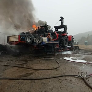 По предварительной информации Амурского центра ГЗ и ПБ, на стоянке возле кафе «Встреча» на федеральной трассе в Серышевском округе открытым пламенем с раннего утра горели две груженые фуры с тралами, на которых находятся авторезина и трактор.