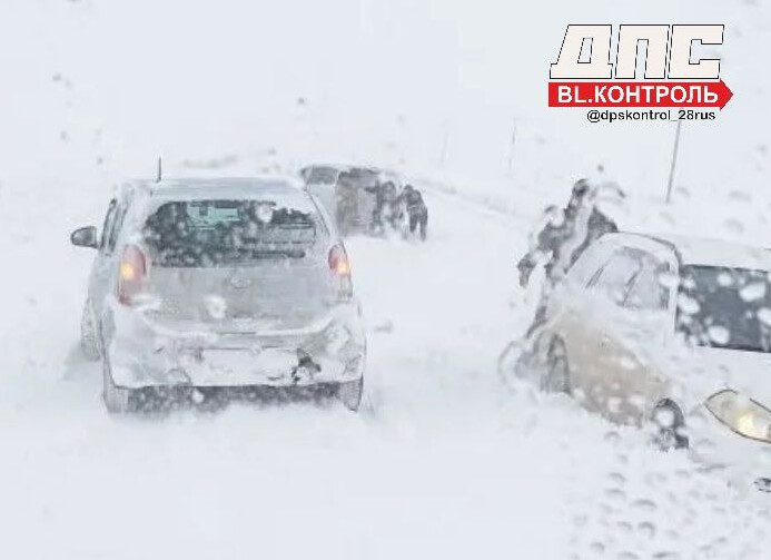 Telegram-канал dpskontrol_28rus опубликовал фото машин, которые буквально увязли в снегу. Сообщается, что такая дорога возле Тамбовки.