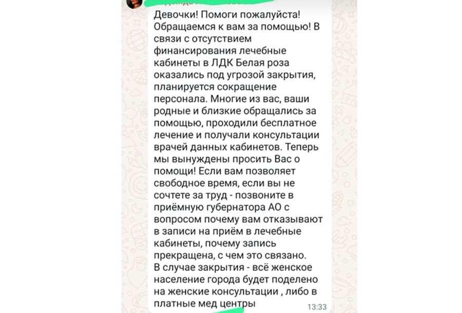 «Девочки! Помогите, пожалуйста! Обращаемся к вам за помощью! В связи с отсутствием финансирования лечебные кабинеты в ЛДК Белая роза оказались под угрозой закрытия, планируется сокращение персонала. Многие из вас, ваши родные и близкие обращались за помощью, проходили бесплатное лечение и получали консультации врачей данных кабинетов. Теперь мы вынуждены просить вас о помощи! Если вам позволяет свободное время, если вы не сочтете за труд — позвоните в приемную губернатора АО с вопросом, почему вам отказывают в записи на прием в лечебные кабинеты, почему запись прекращена, с чем это связано. В случае закрытия все женское население города будет поделено на женские консультации либо в платные медцентры».