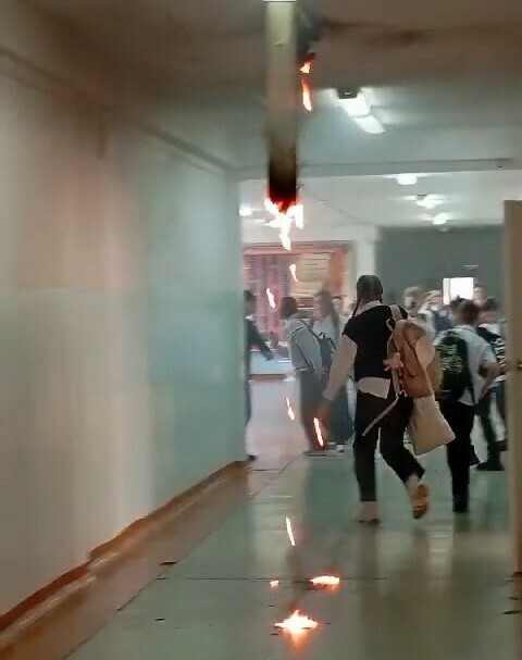 В непосредственной близости от этого места находится кабинет, из которого выбегают дети. Но не все торопятся покинуть опасный участок, некоторые снимают происходящее на телефон.