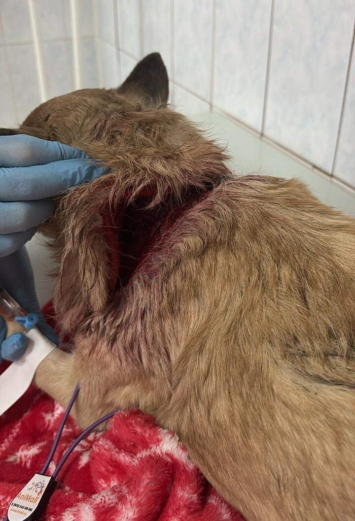 Ужаснувшись нанесенным собаке ранам – на шее животного зиял порез – волонтёры доставили её в клинику. Ветеринары выявили большую резаную рану, требующую экстренного вмешательства. Животное срочно отправили на операцию для ушивания повреждённой области.