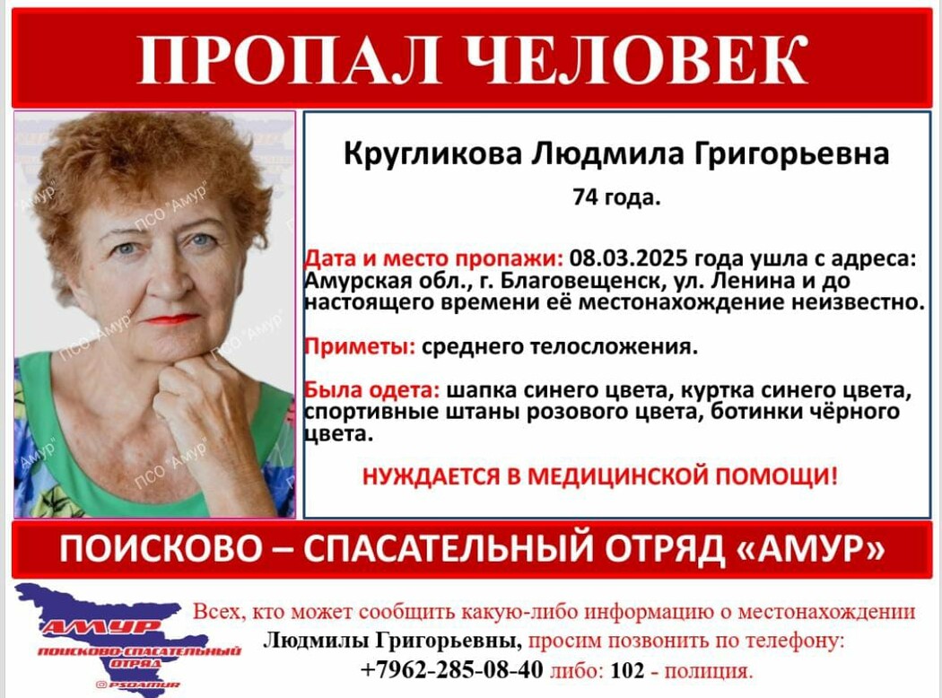 Всех, кто может обладать какой-либо информацией о местоположении пенсионерки, просят звонить по телефонам: +7-962-285-08-40, либо: 102 – полиция.