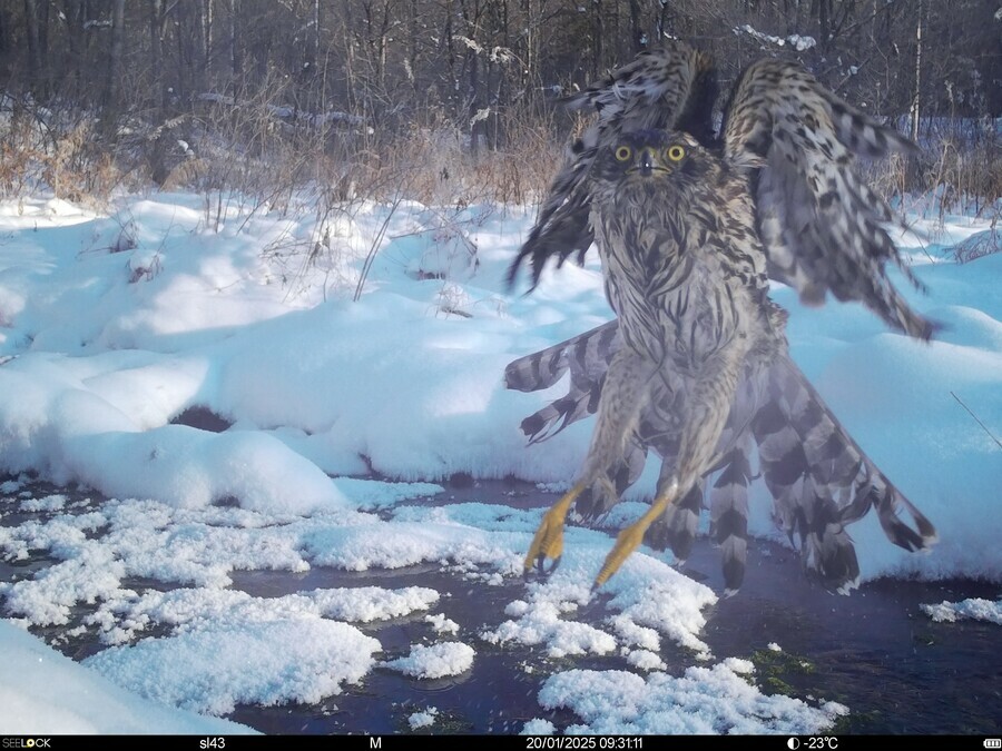 «Когда совершенно не ожидал, что тебя будут снимать. На фото – ястреб-тетеревятник только что искупался в незамерзающей луже в центре заповедника», – поделились специалисты.
