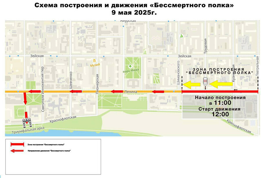 В День Победы, 9 Мая, в Благовещенске состоится шествие «Бессмертного полка». Построение колонны начнется в 11:00 на Ленина в районе пересечения с Шимановского. Движение колонны начнется в 12:00.
