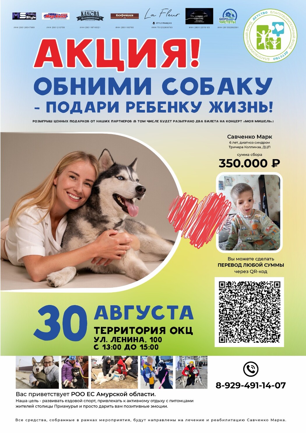 В Благовещенске в субботу, 30 августа, пройдет акция «Обними собаку – подари ребенку жизнь!». Мероприятие проводится для того, чтобы собрать 350 тысяч рублей для маленького амурчанина Марка Савченко.