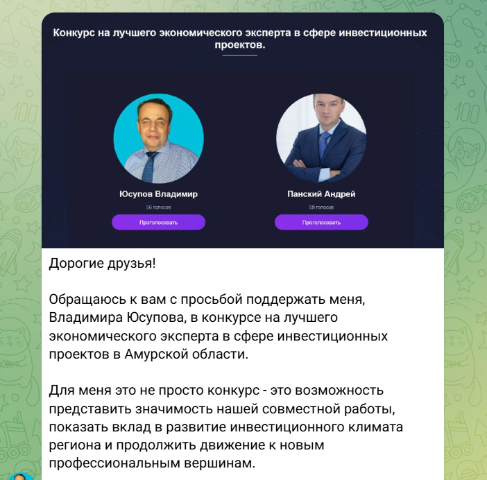 «Дорогие друзья! Обращаюсь к вам с просьбой поддержать меня в конкурсе на лучшего экономического эксперта в сфере инвестиционных проектов в Амурской области. Для меня это не просто конкурс – это возможность представить значимость нашей совместной работы, показать вклад в развитие инвестиционного климата региона и продолжить движение к новым профессиональным вершинам. Если вы считаете мой опыт и подход достойными, прошу вас оказать поддержку. Спасибо каждому за доверие и внимание!» – говорилось в тексте обращения, созданного от имени бизнесмена Владимира Юсупова.