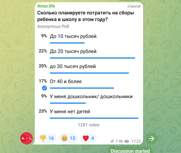 Ранее Amur.life проводил опрос среди пользователей, которых спросили, сколько они готовы потратить на сборы в школу. Большинство родителей школьников ответили, что в семейном бюджете на это у них предусмотрено от 20 до 30 тысяч рублей.