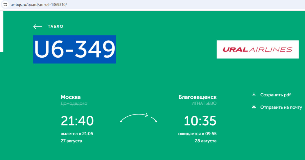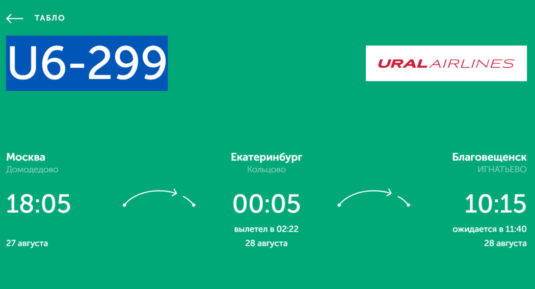 Второй рейс из Москвы - U6-299 прибудет в 11:40 вместо 10.15. Позднее прибытие связано с поздним вылетом из Екатеринбурга, где была промежуточная посадка. Вместо 00:05 самолет вылетел в Благовещенск из аэропорта Кольцово в 2:22.