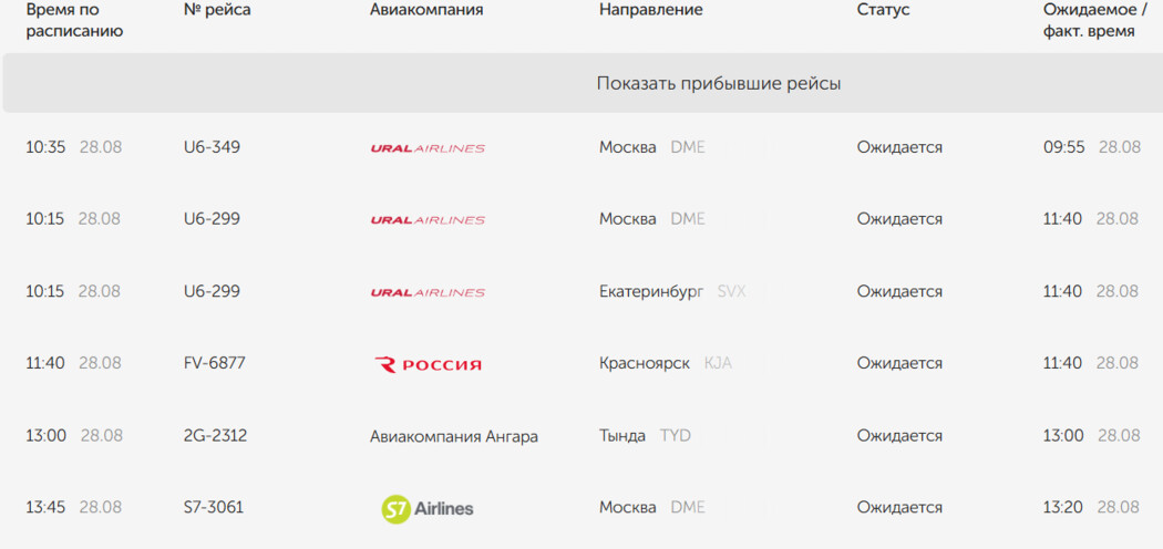 Как указано на онлайн-табло благовещенского аэропорта, рейс U6-349 из аэропорта Домодедово вылетел в 21.05 вместо 21.40. Прибытие ожидается в 9:55 вместо 10.35.