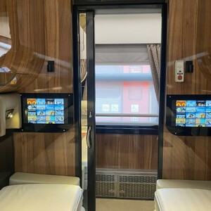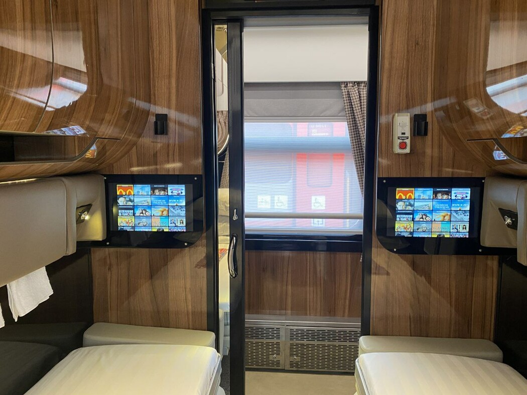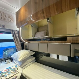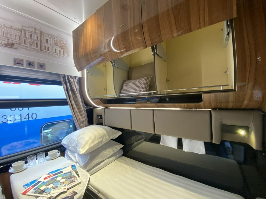 Всего в таком вагоне восемь двухместных купе. В каждом из них есть сейф, кнопки вызова проводника, мультимедийные экраны, розетки и USB-разъемы. Длина спальных полок увеличена на 16 сантиметров – с 184 до 200 сантиметров. Кроме того, над спальными местами появились большие закрытые полки для ручной клади. За счет этого появилось больше пространства для хранения ручной клади и спортинвентаря, отметили в компании.