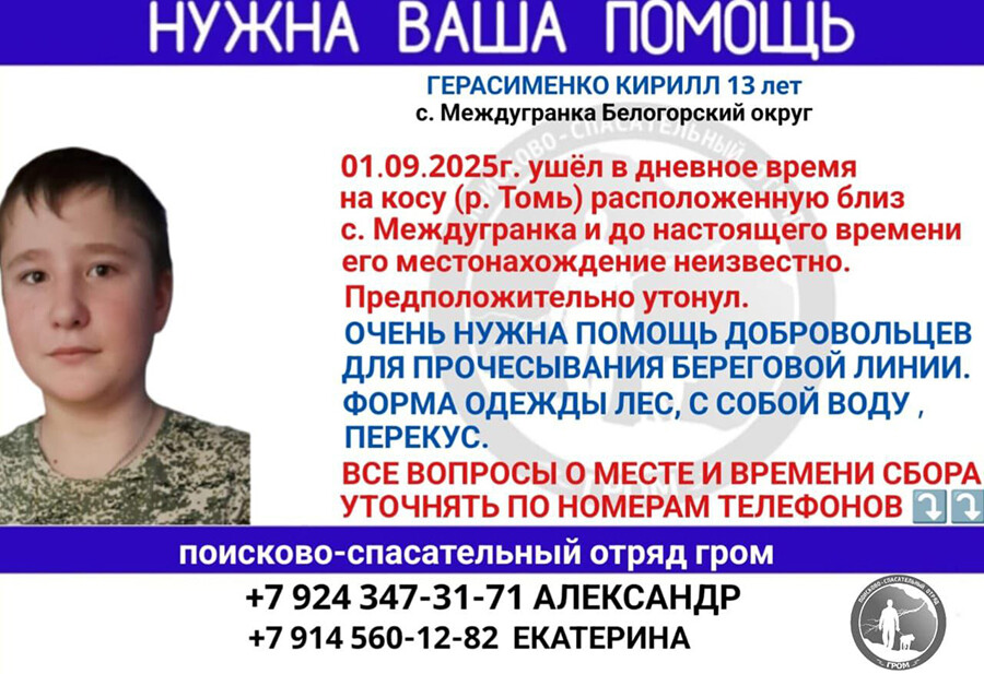 «Мы обращаемся за помощью в распространении ориентировки, а также за помощью в физическом поиске к жителям сел Междугранка, Томское, Тавричанка, Бочкаревка и города Белогорска. Если вам известно местонахождение Кирилла или вы готовы выйти на поиск, незамедлительно обратитесь к волонтёрам, чьи номера указаны в ориентировке, или в дежурную часть своего населённого пункта. Друзья, этот случай является очень страшным и тяжёлым горем для семьи Кирилла. Не оставайтесь в стороне. Помните, что любая помощь может приблизить к завершению поиска», – обратились к амурчанам волонтеры ПСО «Гром».