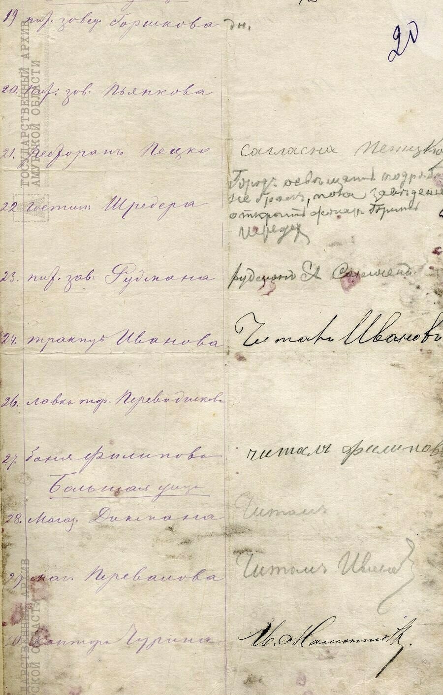 «Документ уникальный, потому что в нем можно увидеть оригиналы подписей известных благовещенцев. В списке «содержателей» «публичных заведений» такие небезызвестные имена, как Нино, Пьянков, Чурин, а также собственноручные подписи некоторых предпринимателей», - рассказали в архиве.