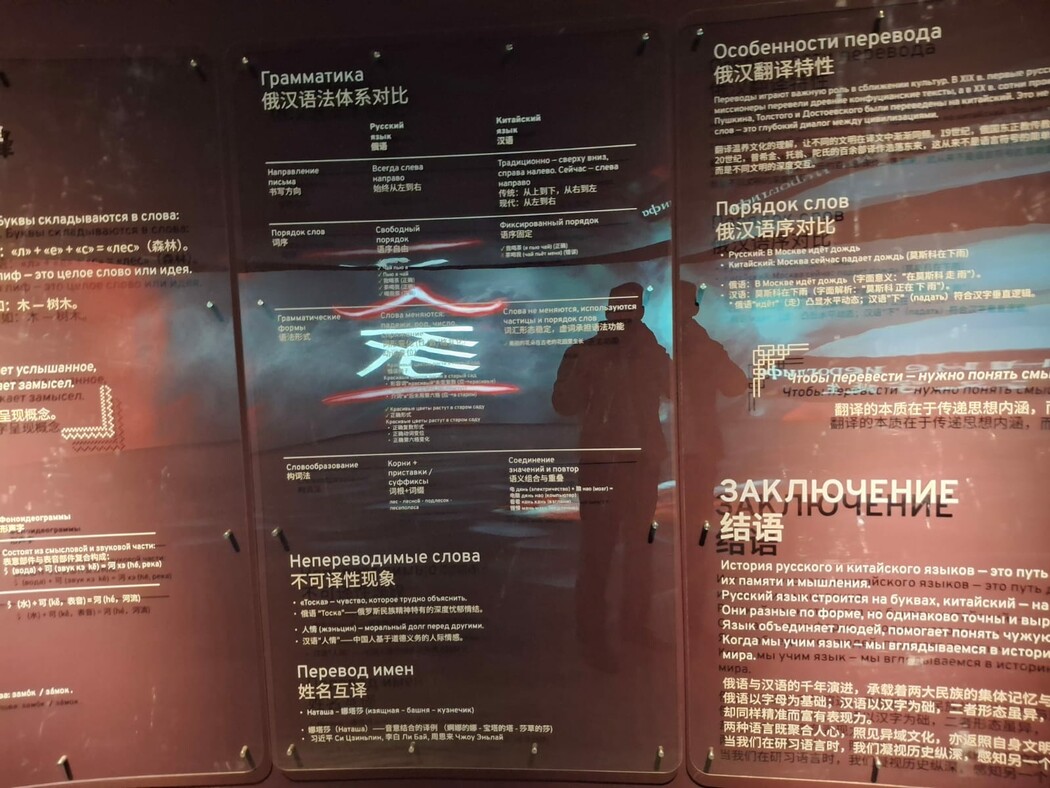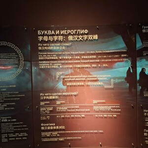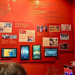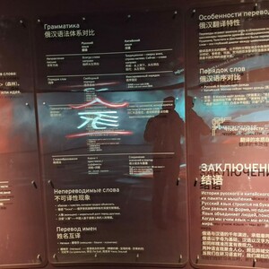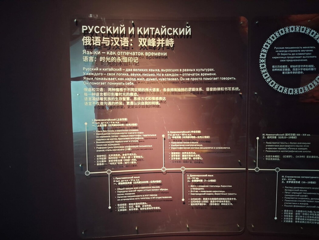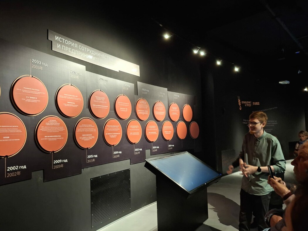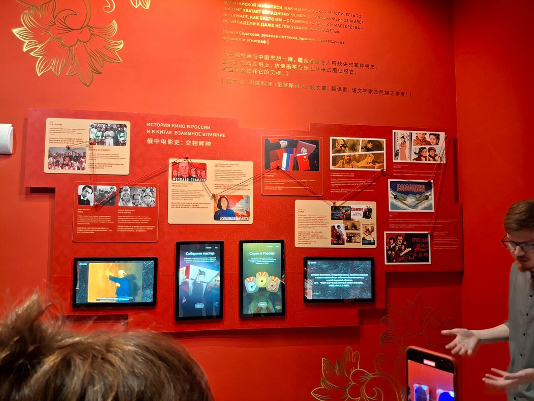 Далее гости отправились на экскурсии по залам. В первом зале русского и китайского языков участников сразу погрузили буквально внутрь видеоролика об отношениях двух стран.