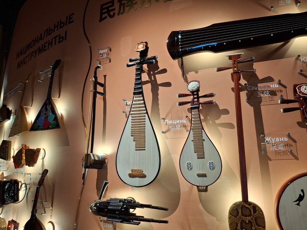 В следующем зале музыкальных инструментов представлены традиционные российские и китайские инструменты, а нажав кнопку на интерактивной панели можно послушать, как они звучат, или услышать, например, российскую мелодию, исполненную на китайском инструменте. Все инструменты настоящие, не муляжи, – подчеркивает Павел Жирнов.