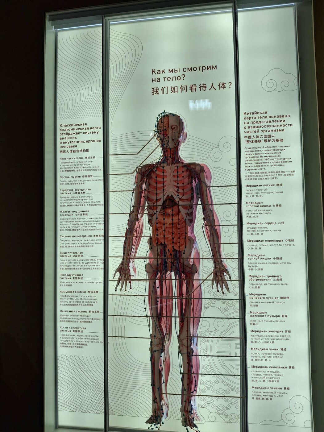 В зале здравоохранения, по словам Павла Жирнова, самый интересный экспонат - фигура человека, на которой наглядно представлено, что с точки зрения китайской медицины человек состоит из энергетических точек, и каждая отвечает за определённый орган. Воздействуя на эти точки иглоукалыванием или прижиганием, можно излечить тот или иной орган.