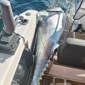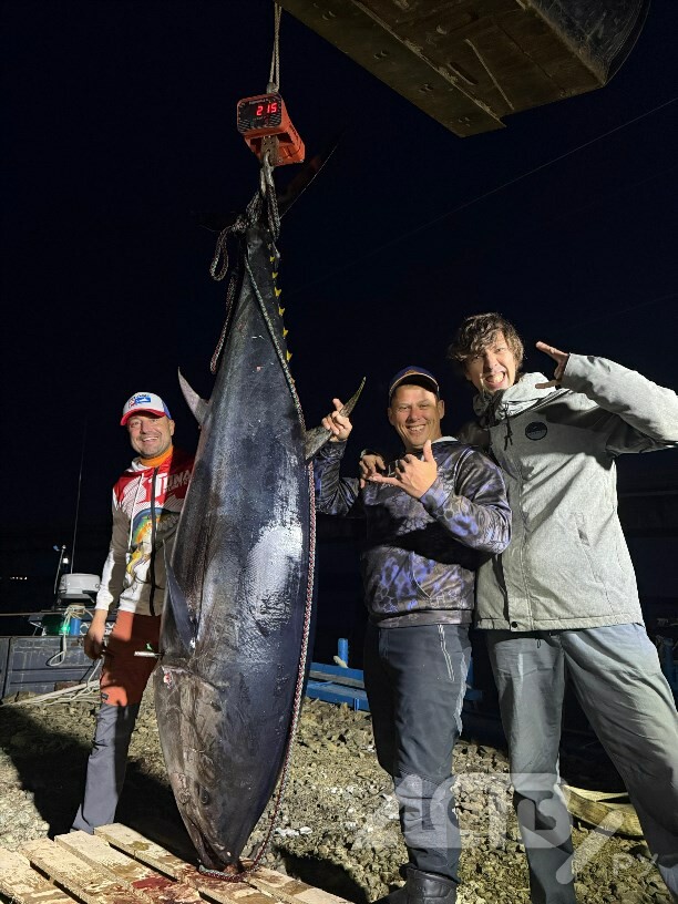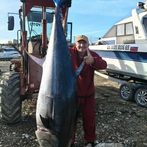 «Мы ловим тунца уже 4 года. Профессионально. Сначала начинали ловить в Невельске, но там мелкая рыба - до 50 килограммов. В этом году в июле попался тунец весом 87 килограммов, на Курилах - почти 160 килограммов. Но настоящий трофей нас все-таки ждал дома, на Сахалине. Четыре дня назад выудили экземпляр в 178 килограммов, а вчера поставили личный рекорд - 215 килограммов!» - рассказал Денис Мамыркин.