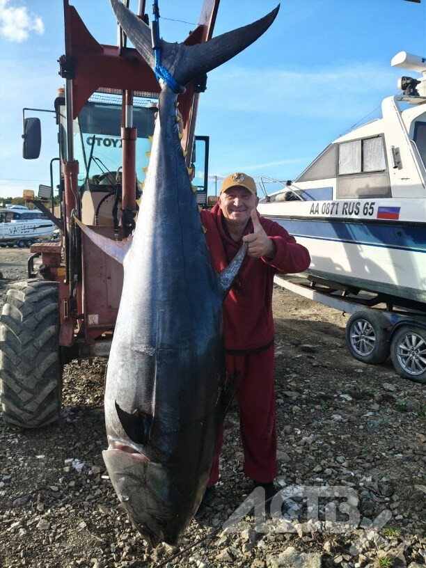 Огромные тунцы подошли к берегам Сахалина в начале октября. Рыбин весом свыше 200 килограммов выловили сразу несколько экипажей катеров. Чтобы взвесить их, понадобилась техника.