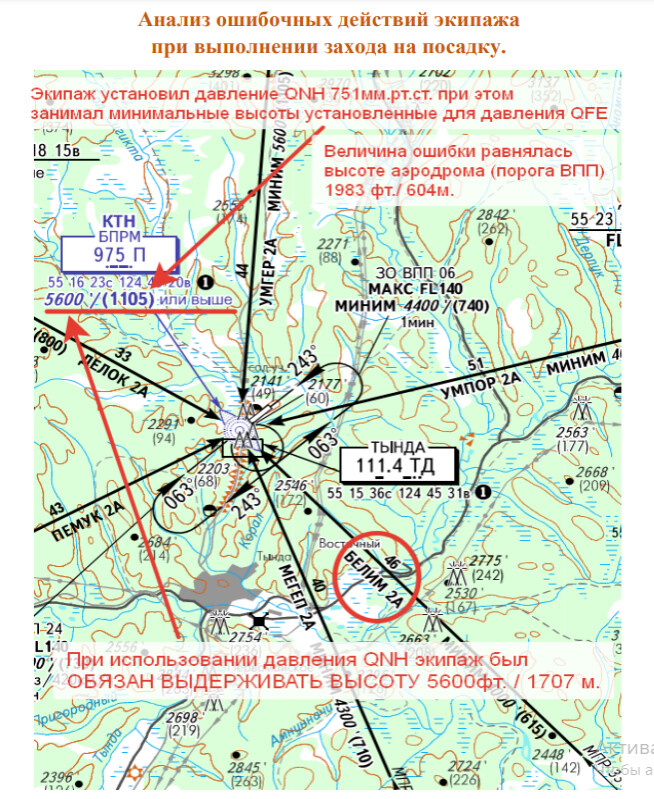 – Слева на схеме мы видим высоту 5 600 футов по QNH, справа в скобках стоит высота 1 105 метров – это по QFE. Получается, пилоту надо к 1105 прибавить 600 метров, и уже высоту поставить 1 700 метров. Это надо в голове прибавить. А он всю жизнь летал по QFE, он установил давление по QNH, высоту поставил в скобках 1105. И он уже сам себя на 600 метров обманул. Думаю, они были чем-то отвлечены, что-то ещё делали. Это я говорю при условии, если мы точно знаем, что самолет был исправен. Они чем-то были заняты, судя по тому, что они боковую закрутили, у них GPS не работали, они занялись определением своего местоположения, и столкнулись с деревьями.