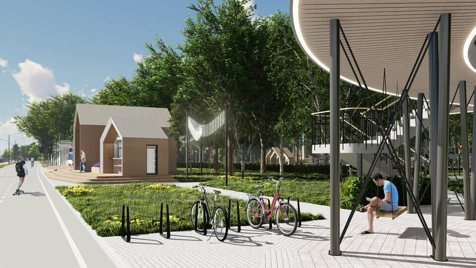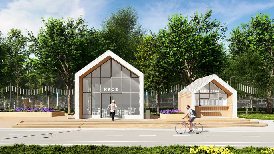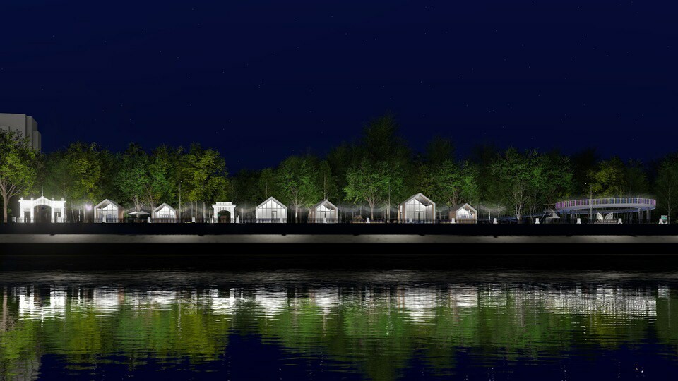 На участках парка, примыкающих к набережной, разместятся павильоны, зона отдыха с шезлонгами, входные порталы — светящиеся ворота с отсылками к русскому зодчеству. Кроме того, в парке появятся, зоны общения и спокойного отдыха с беседками, сцена-подиум для проведения мероприятий и кинопоказов под открытым небом.