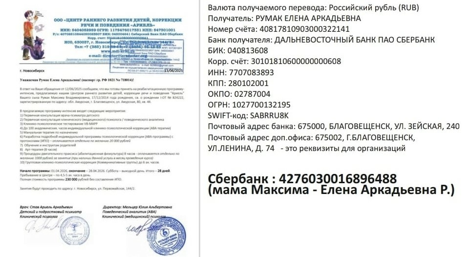 На лечение в Новосибирске Максима ждут 1 апреля 2026 года. Программа реабилитации расписана до конца апреля, стоимость - 230 тысяч рублей. Максима проконсультируют врачи психиатр и психолог, он пройдет необходимое тестирование и до 100 академических часов индивидуальной клинико-психологической коррекции (АВА-терапии). Также в программе реабилитации арт-терапия, абилитационная физкультура и занятия в группах.