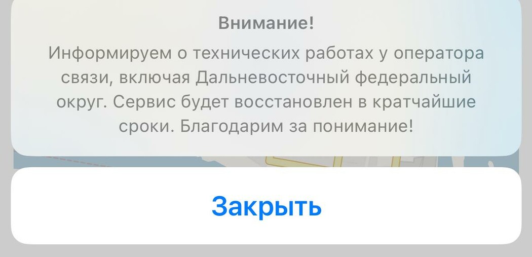 При заходе в приложении сказано, что оператор проводит технические работы, включая Дальневосточный федеральный округ.