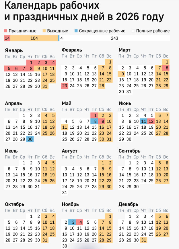 Россиян в 2026 году ожидает 118 выходных и праздничных дней и 247 рабочих дней. Это следует из норм Трудового кодекса РФ и производственного календаря, утвержденного правительством РФ.
