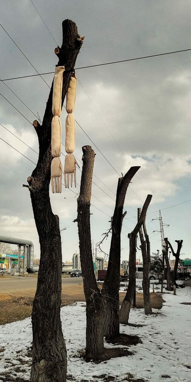 В Благовещенске появился новый арт-объект – безжизненные руки, свисающие со ствола такого же дерева. Оказалось, что автор этого творения – известный в городе художник Николай Рыбак, один из основателей творческой группы «Сигналы». Своему новому объекту он дал меткое название «Гипоксия».