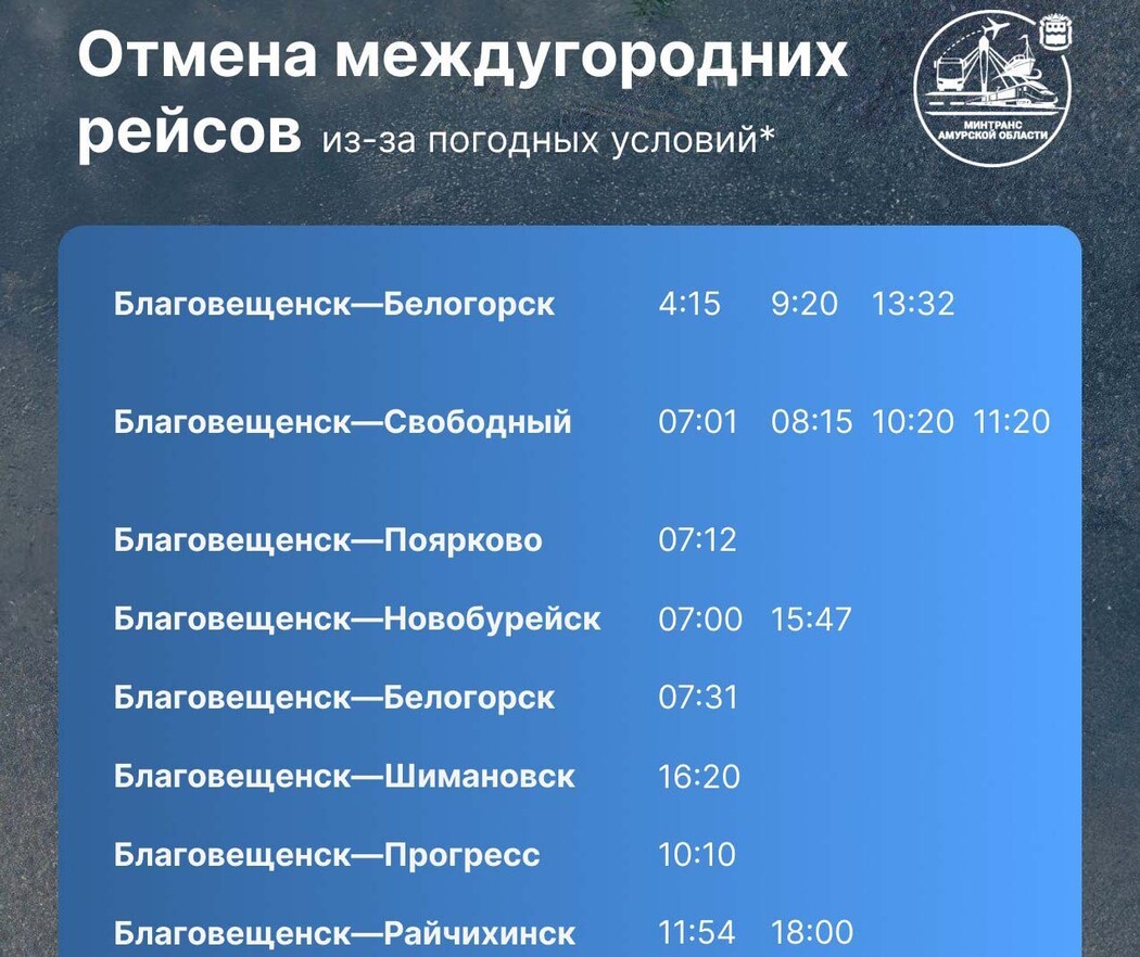 – Благовещенск – Райчихинск, 11:54, 18:00.