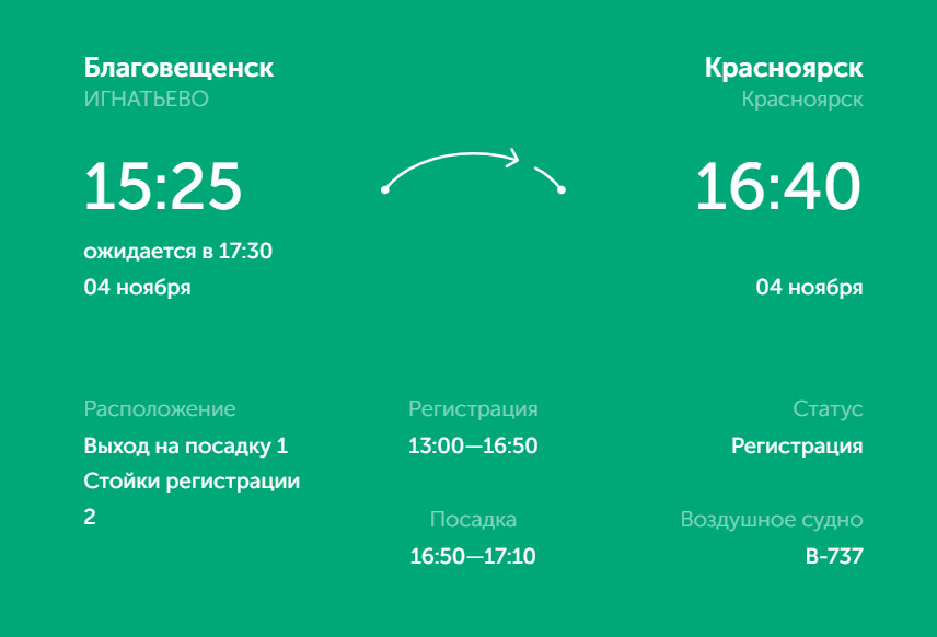 О том, что самолет не прилетел в Благовещенск, а сделал посадку в Иркутске, сообщили амурские авиаторы. По информации на онлайн-табло аэропорта Благовещенска, рейс FV6879 из Красноярска прибудет в Благовещенск в 16:30. Обратный вылет запланирован на 17:30.