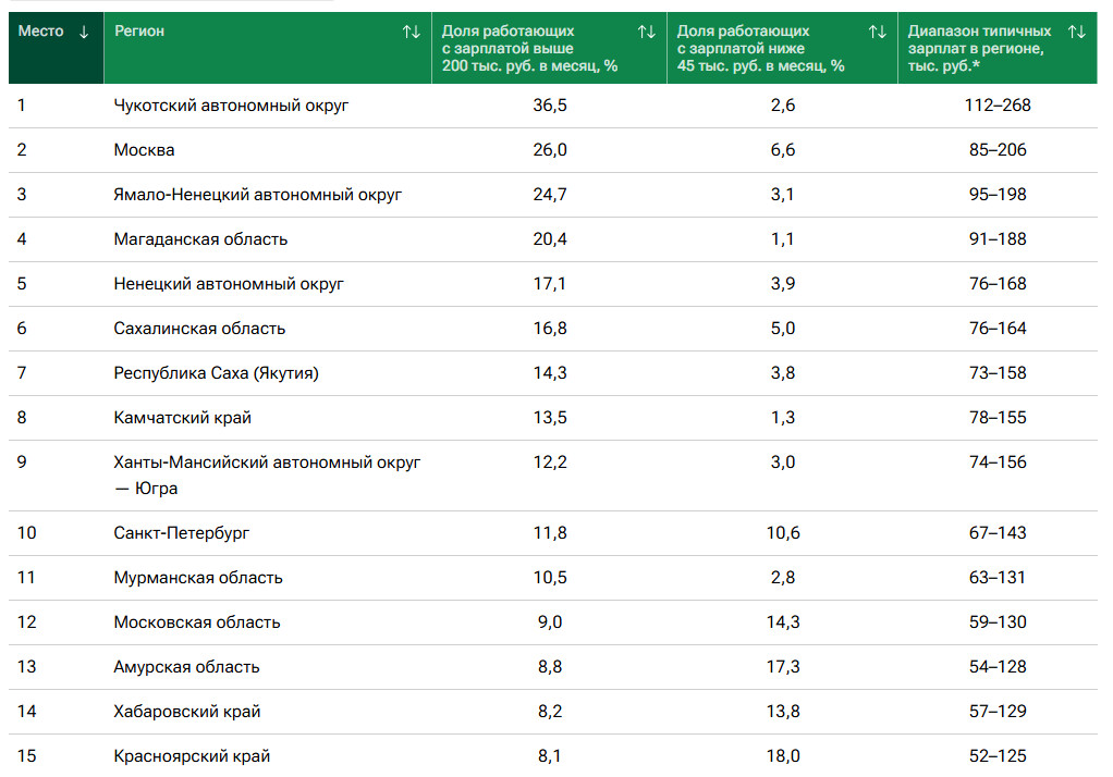 По данным статистики, в регионы типичными являются зарплаты от 54 до 128 тысяч рублей в месяц, 17,3 % работающих получают зарплаты ниже 45 тысяч рублей, 8,8 % - свыше 200 тысяч рублей.