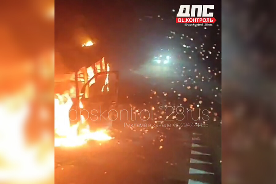 В Амурской области в ечером 12 ноября на автодороге «Амур» произошло столкновение автобуса и грузового автомобиля. Автобус загорелся. К месту были направлены два боевых расчёта и оперативная группа МЧС России.