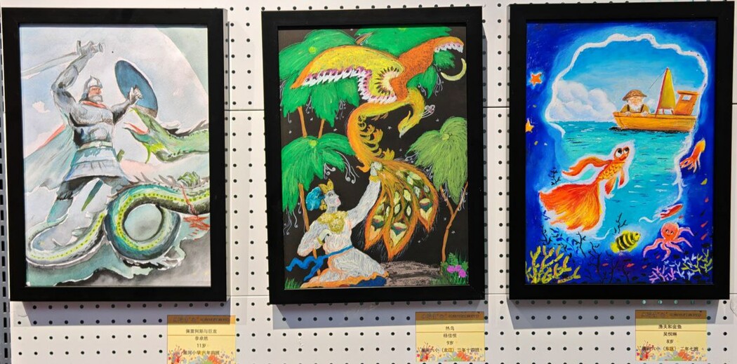 На выставке представлены 25 работ российских ребят на тему «Мифы Китая» и еще 25 работ китайских детей на тему «Русские сказки». Рисунки китайских детей с Ильей Муромцем и Змеем Горынычем, жар-птицей, царевной и серым волком, рыбаком и рыбкой, Морозко и другими персонажами из русских сказок органично сочетались с рисунками российских подростков на тему китайских мифов. Некоторые китайские рисунки напоминали иллюстрации из сборников «Русские народные сказки», другие, особенно новогодние, словно сошли с праздничных почтовых открыток.
