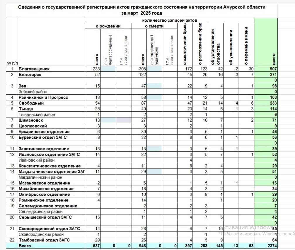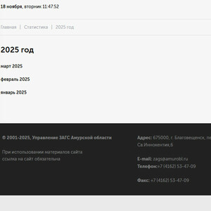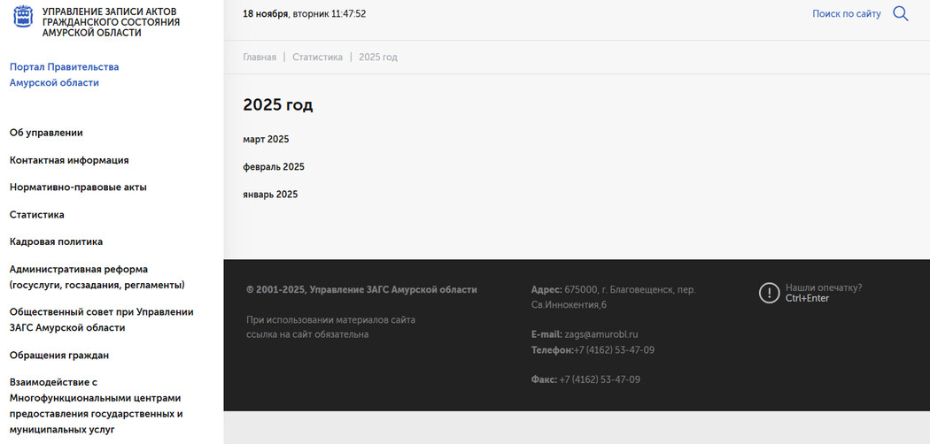 Так, на сайте управления ЗАГС по Амурской области в разделе «статистика» на протяжении нескольких лет (с 2018 года) ежемесячно публиковались данные о рождаемости и смертности в Приамурье, а также информация о количестве других актов гражданского состояния (браках, разводах, смене имени и других). Последние такие данные были приведены за март 2025 года; с тех пор раздел не наполнялся.
