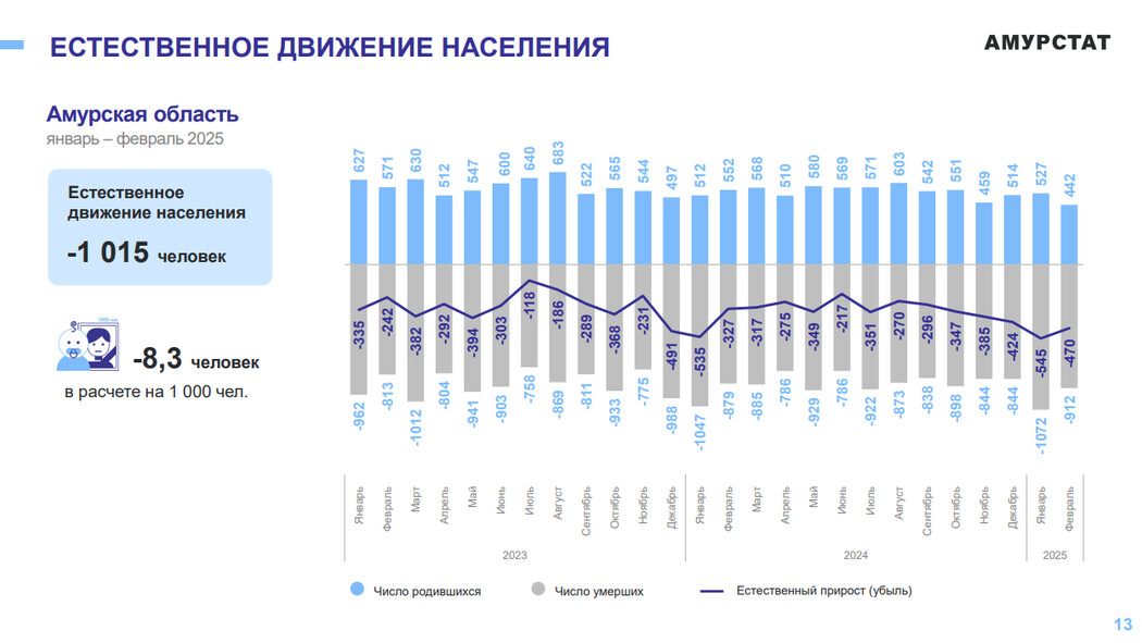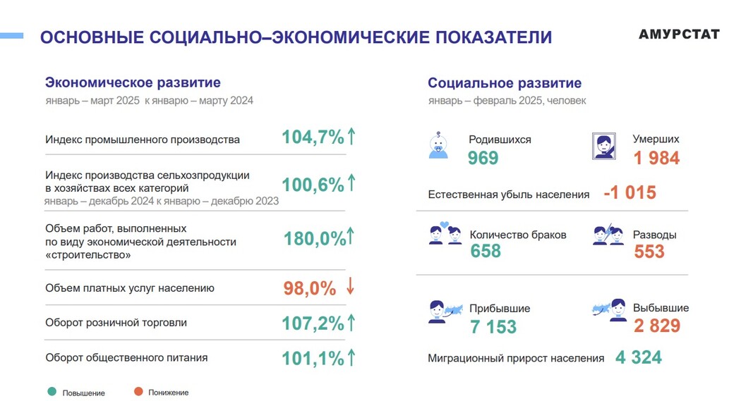 На сайте Амурстата ежемесячно появлялась статистика о количестве родившихся, умерших, а также прибывших и выбывших из региона. Публиковались и данные о естественной убыли населения и миграционном приросте. В частности, эти данные можно было увидеть в числе основных социально-экономических показателей, которые ведомство регулярно приводило в отчетах. Начиная с марта эти сведения не обновлялись: приводились последние обнародованные данные за январь-февраль 2025 года.