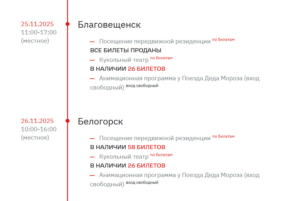 «На странице продажи в 12:00 по московскому времени будут доступны дополнительные сеансы на посещение передвижной резиденции Деда Мороза и Кукольного театра. Напоминаем, что количество билетов ограничено: 15 мест на 1 сеанс в передвижной резиденции, длительность сеанса – 45 минут. Для Кукольного театра: 26 мест на 1 сеанс, длительность сеанса – 50 минут», – сообщили в пресс-службе РЖД.