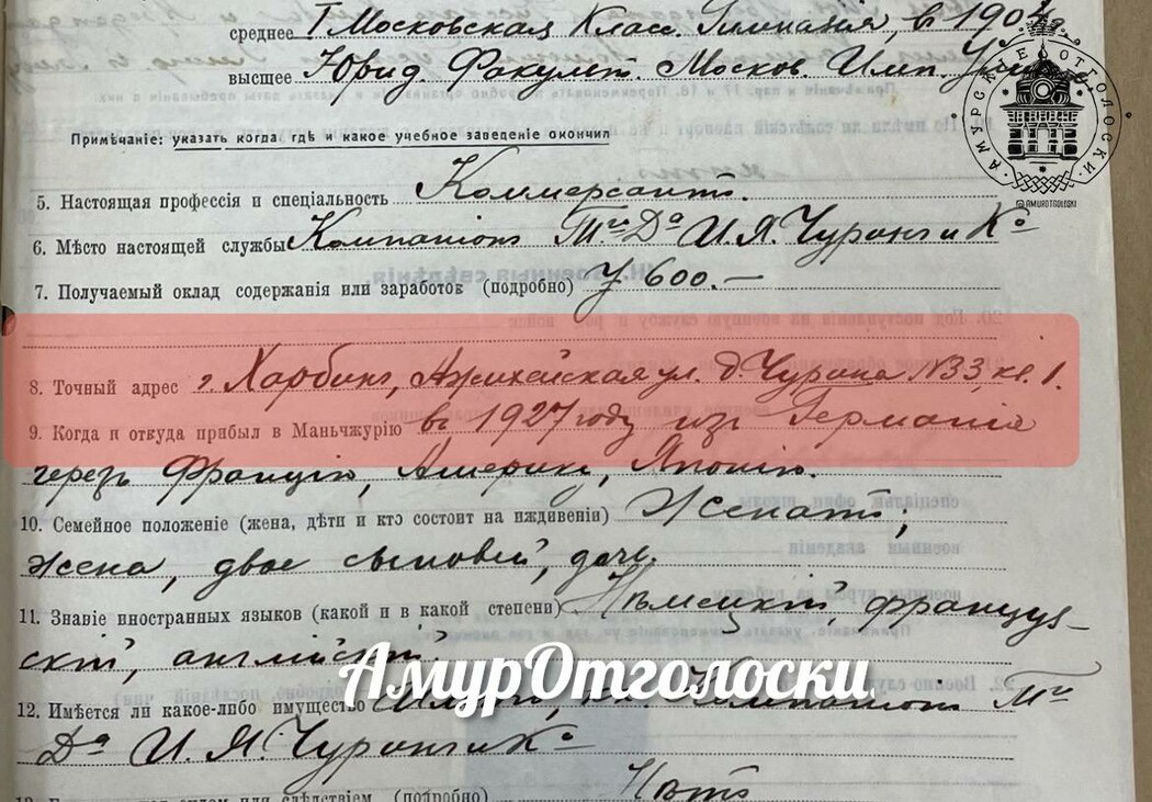 Краеведческий портал «Амурские отголоски» совершил путешествие в прошлое на 100 лет назад, побывав в Харбине в доме, где жил управляющий значительной частью чуринской империи Александр Касьянов. После революции он эмигрировал из Благовещенска в Китай, где до 1925 года развивал зарубежный филиал компании.