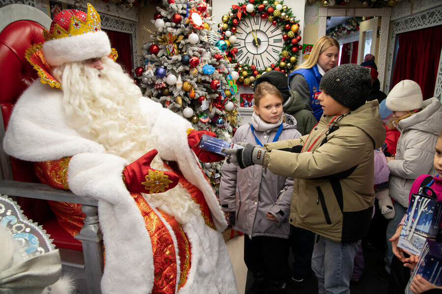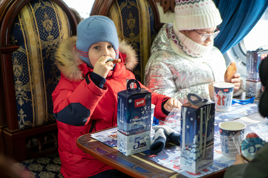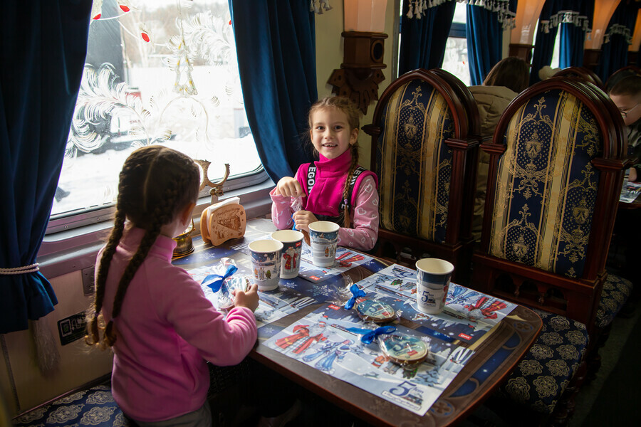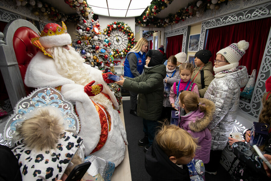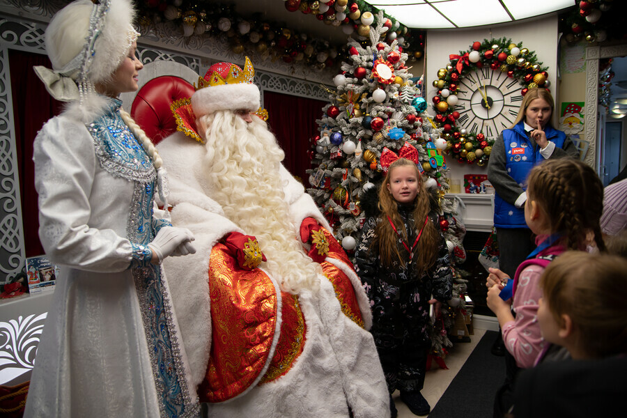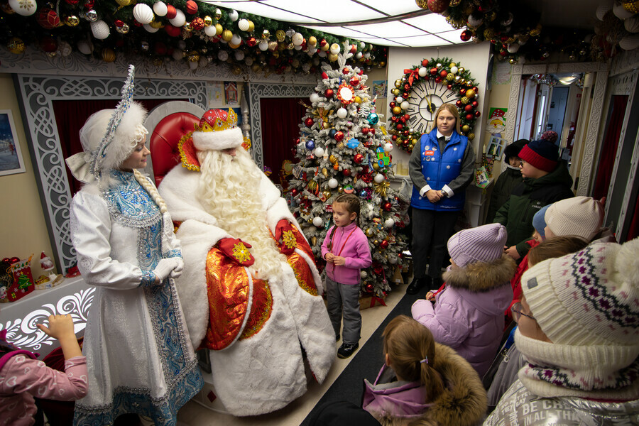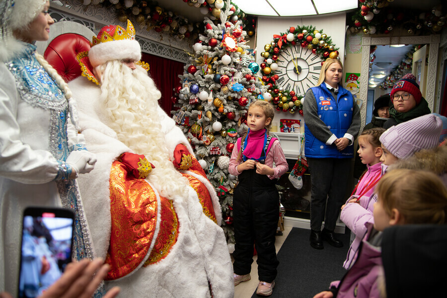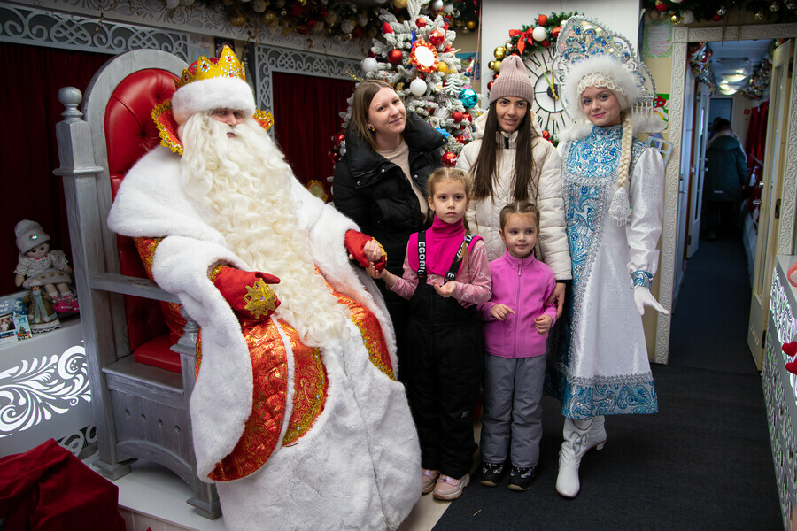 Те, кто успел приобрести билеты, смогли попасть и в основные вагоны поезда – приемную Деда Мороза, сказочную деревню, театр кукол. В несколько вагонов – «Снежная Королева», «Лавка», «Буфет» – посещение было свободным для всех желающих.