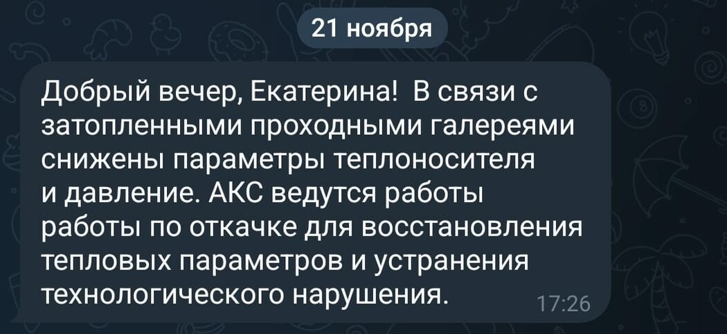 12 ноября благовещенцы снова написали в чат-бот мэра и получили ответ: глава города объяснил, что в связи с затопленными проходными галереями снижены параметры теплоносителя и давление. Работы выполнили специалисты АКС и завершили их в день отключения к вечеру.