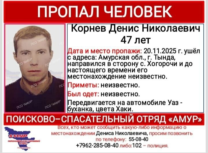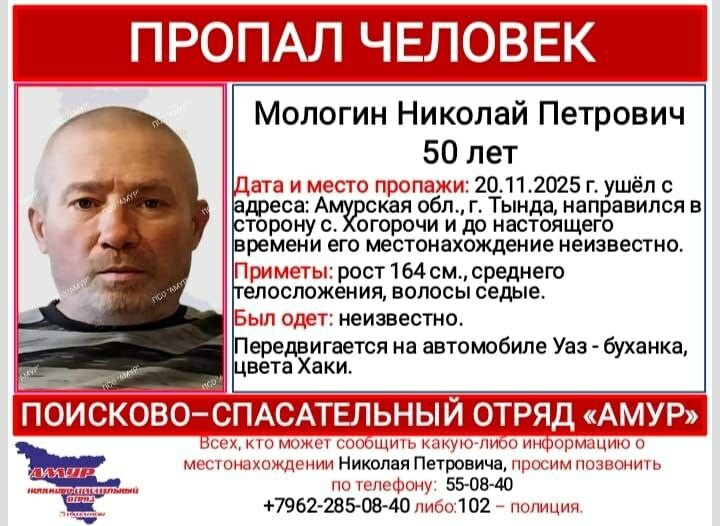 В ориентировках указано, что из Тынды они выдвинулись в сторону Хорогочи на автомобиле УАЗ (буханка) цвета хаки. Когда мужчины вовремя не вернулись, их родные забили тревогу. Волонтеры поисково-спасательного отряда «Амур-Тында» выехали на поиски амурчан.