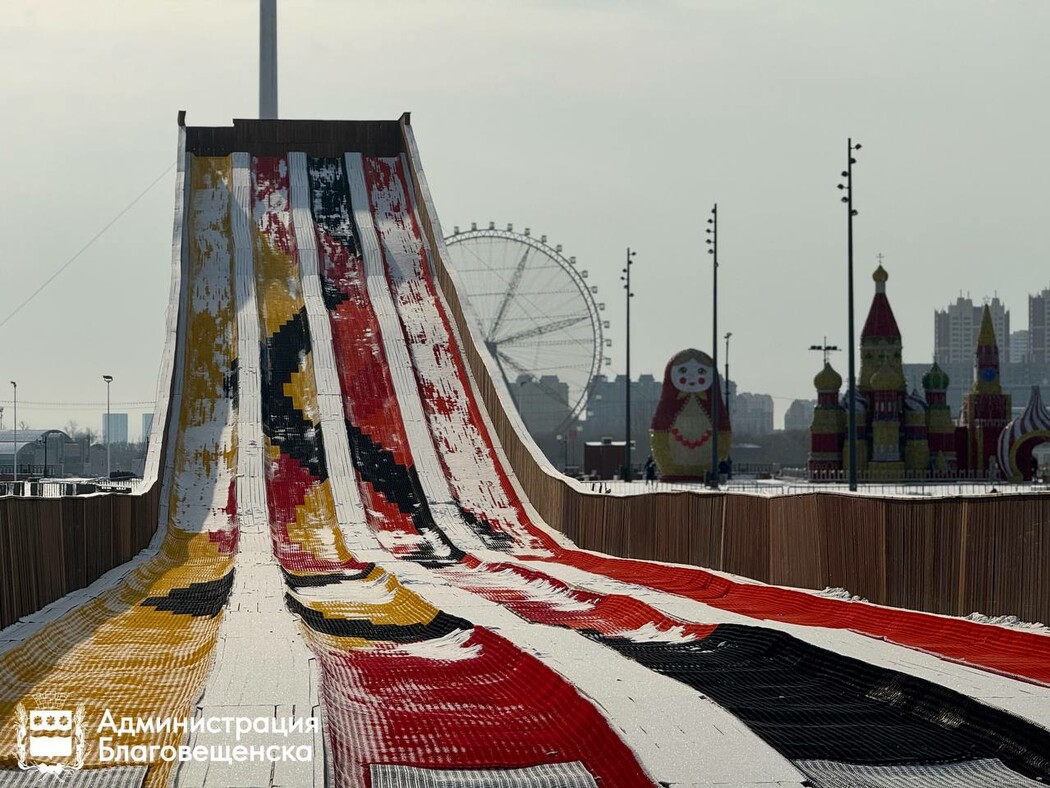 В Благовещенске завершился монтаж тюбинговой горки. Рабочим осталось лишь уложить нескользящее покрытие на ступени и смонтировать освещение на лестнице. Сейчас аттракцион проходит сертификацию Гостехнадзора.