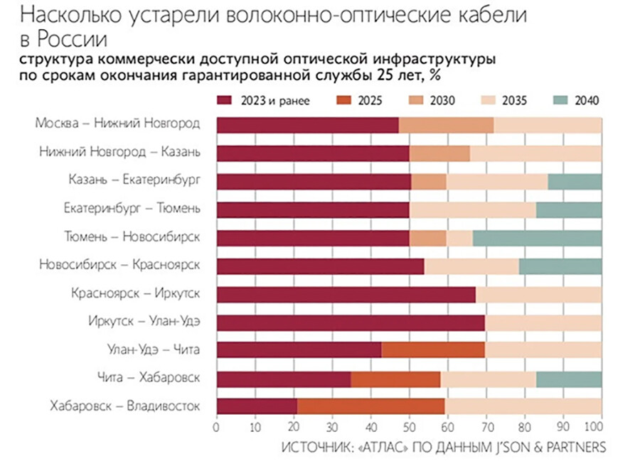 Более половины волоконно-оптической инфраструктуры России — от 50 до 70 % — исчерпает срок гарантийного использования до конца 2025 года. Издание «Ведомости» со ссылкой на данные аналитической компании J"son & Partners, речь идет как минимум о 400 тысячах километрах кабеля, которые расположены на направлении запад-восток.