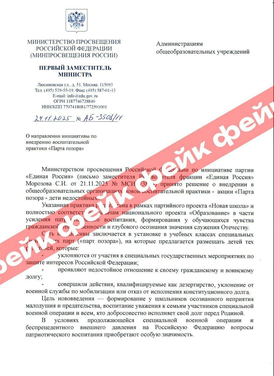 В соцсетях распространяется документ якобы за авторством Минпросвещения РФ. В нем говорится о предложении сделать в школах так называемые парты позора для нерадивых учеников. Выяснилось, что это не более чем фейк.