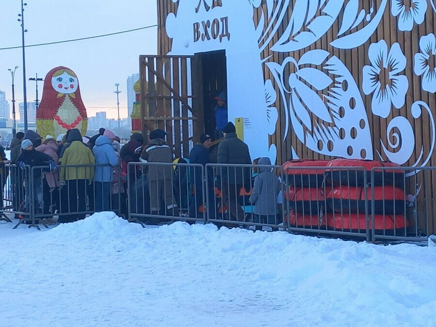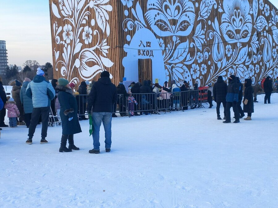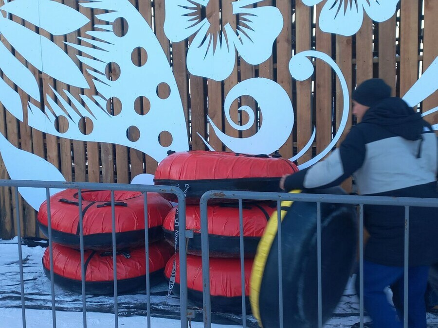 Народу в очереди в середине дня выстроилось не так уж и много. Ограждение у подножия аттракциона не убрано в целях безопасности и, видимо, еще для того, чтобы никто не смог уйти с бесплатным тюбингом, – их выдают желающим прокатиться.