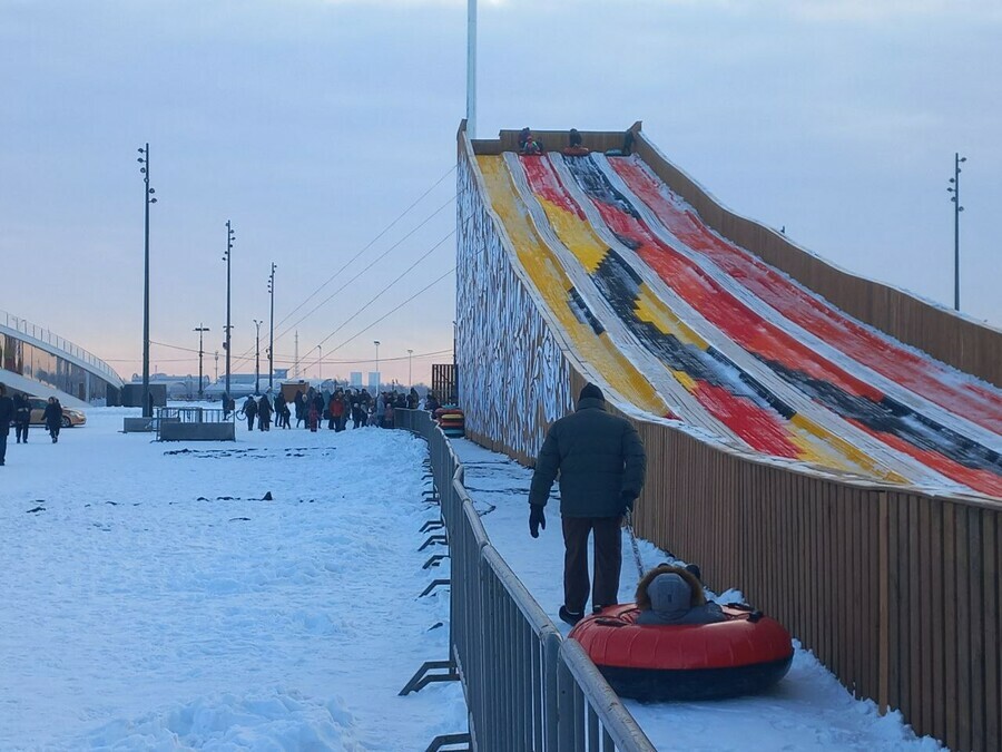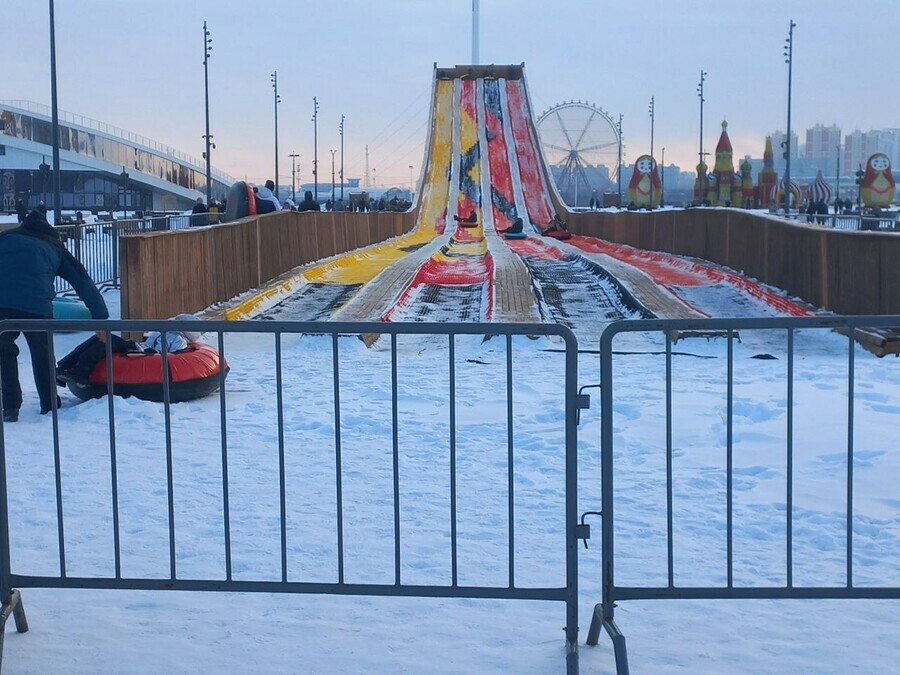 Горожане напрасно опасались нового развлечения: скорость на горке маленькая. И останавливаются тюбинги сразу у конца ската, прилично не доезжая до ограждения.