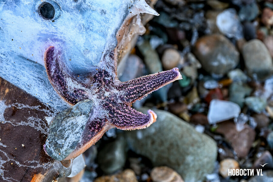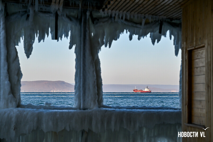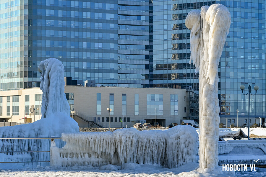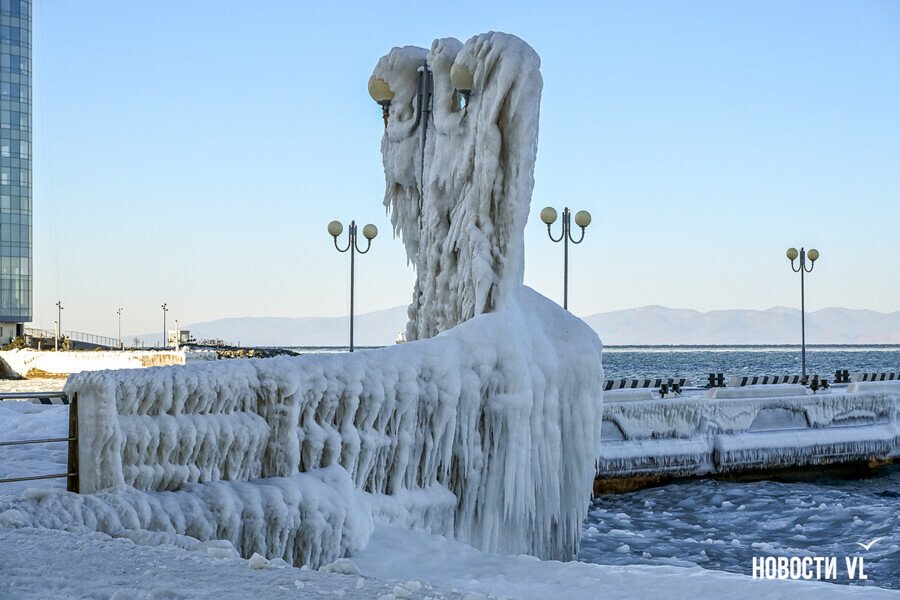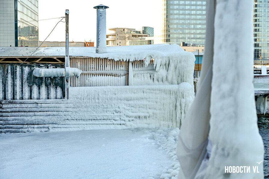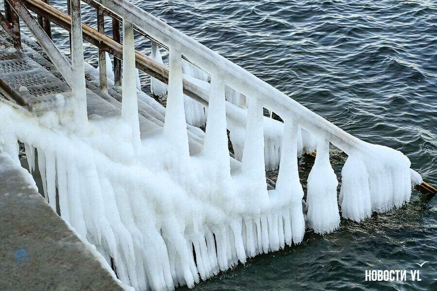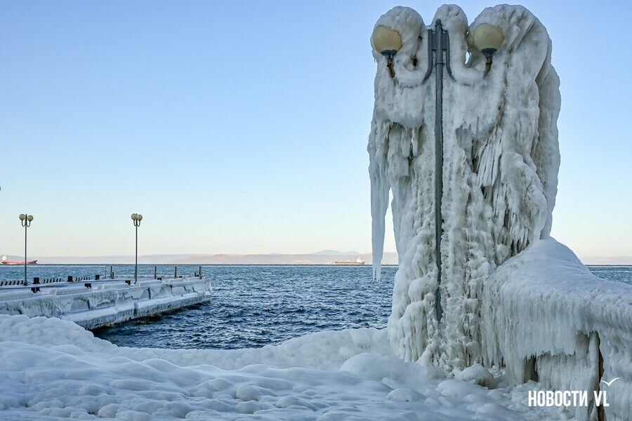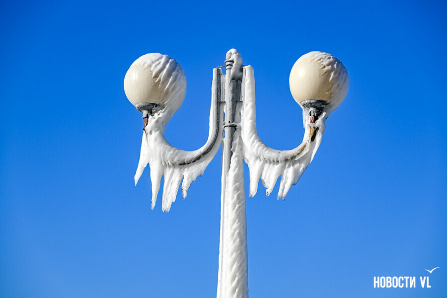 Сильные северные ветра, дующие во Владивостоке зимой, разогнали ещё не успевшие застыть морские волны. Берег Амурского залива превратился в зимнюю сказку - теперь он напоминает ледяную крепость, а круглые фонари – её жителей в плащах с капюшонами.