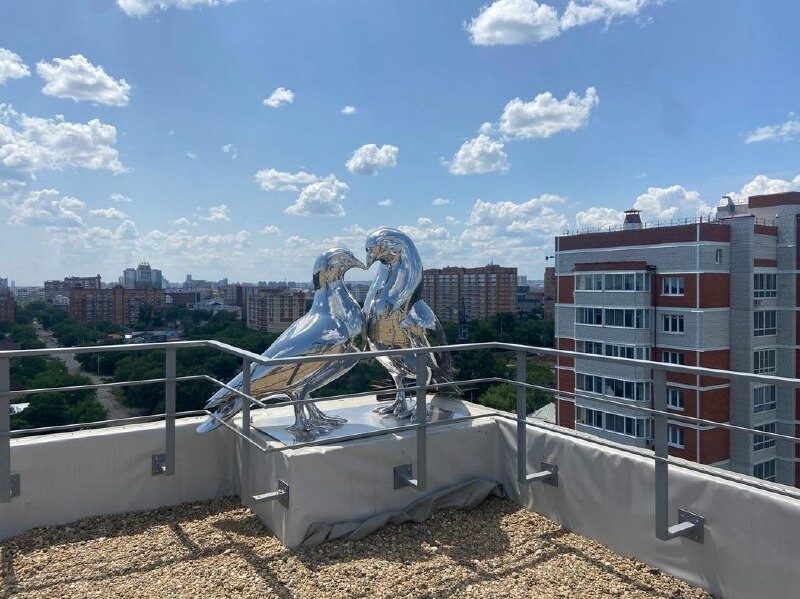 Новый дом привлекает внимание необычным арт-объектом – на крыше дома поселились два голубя хромированного цвета – своего рода олицетворение жилого комплекса «Ты и я». Эту скульптурную группу высотой около двух метров создавали по заказу застройщика. Возможно, будет принято решение «приземлить» птиц на землю – тогда их переместят во двор дома, и арт-объект станет популярным местом для фото и символом ЖК.