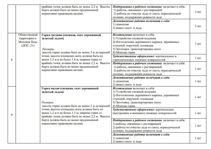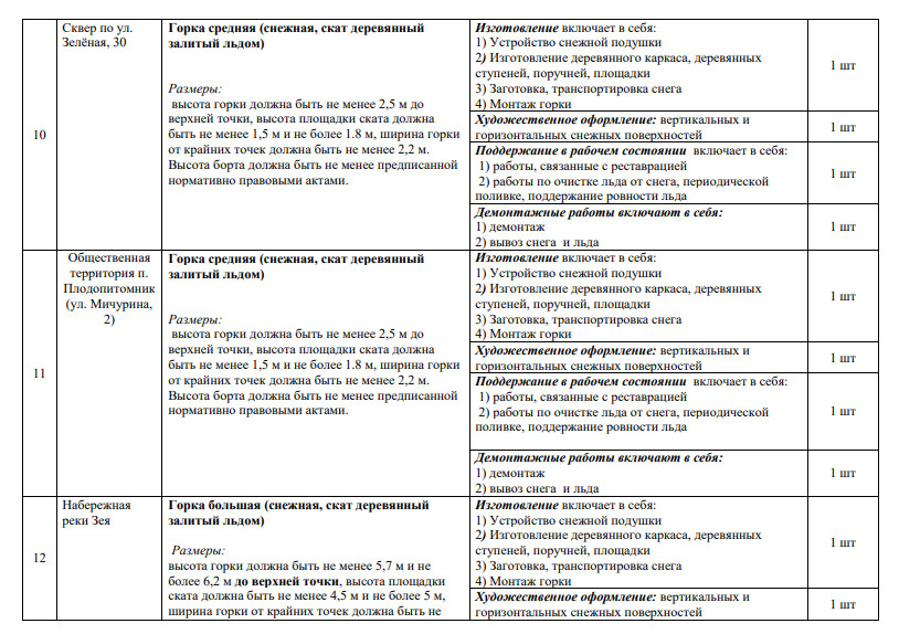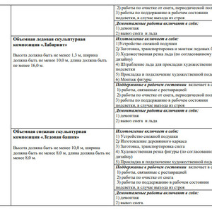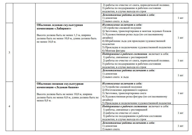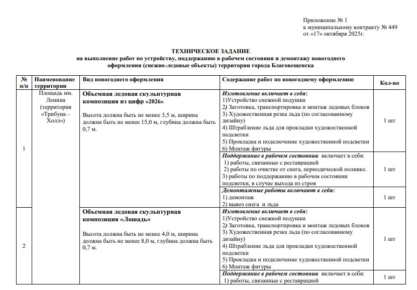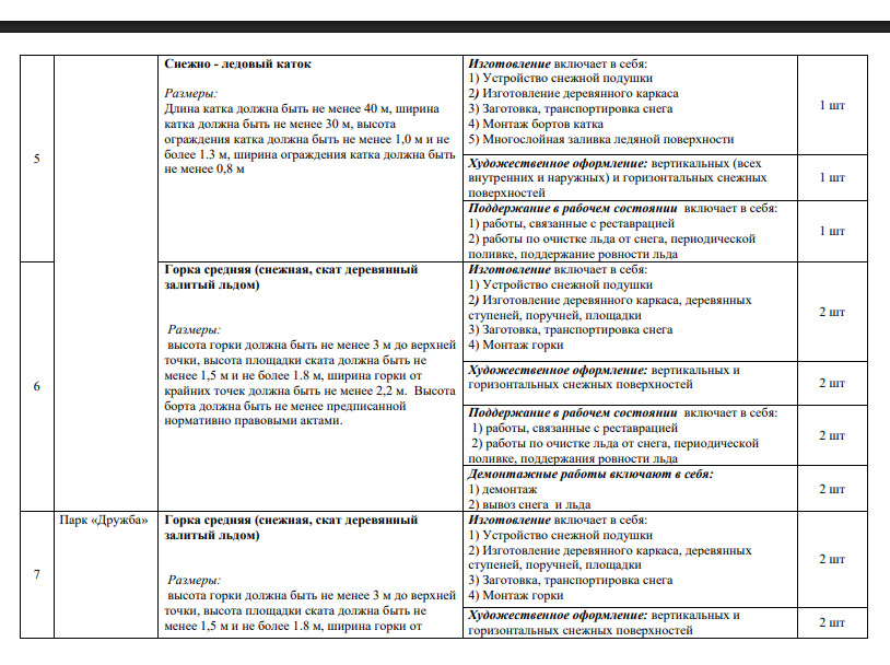 Между тем в техническом задании, приложенном к муниципальному контракту и размещенному на сайте госзакупок, действительно указаны все вышеперечисленные объекты – всего их 14. В списке 8 снежных горок с деревянными скатами и художественным оформлением, каток и объемные скульптурные композиции: цифры «2026» высотой 3,5 метра, снежная башня в 10 метров высотой, лабиринт размерами 10 на 16 метров, 4-метровая лошадь и еще одна ледовая фигура без названия – все с новогодней подсветкой.